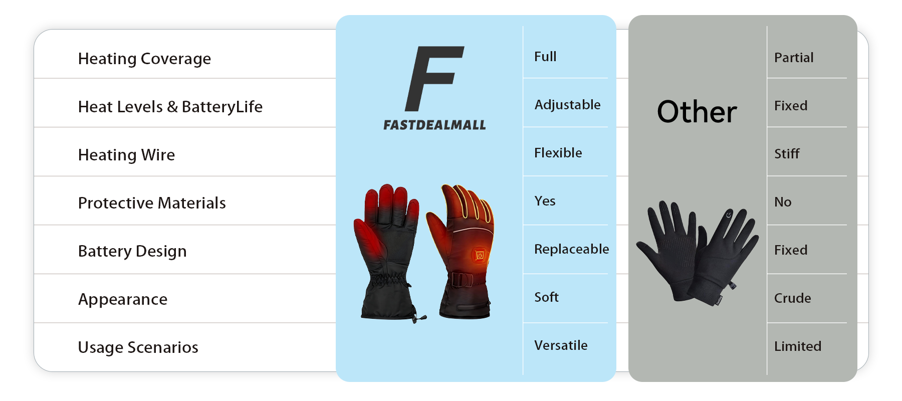 Fastdealmall prioritizes portability, practical design, and reliable warmth. Core features include full-finger heating, adjustable temperature settings, and waterproof protection – providing effortless, instant warmth anytime, anywhere.